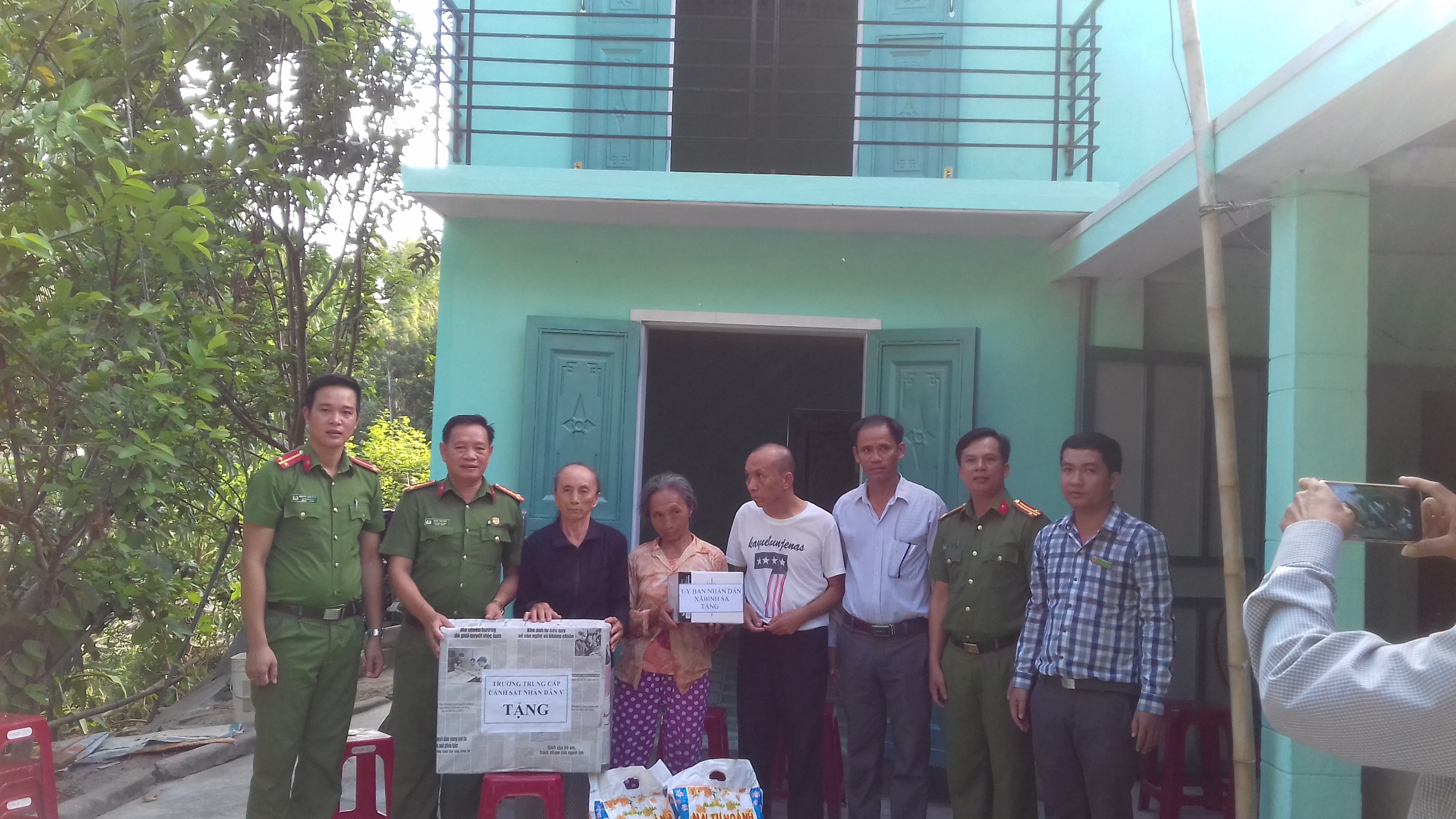 Ảnh: Bà Nhựt ( Áo tím) cùng với chị gái và em trai ( Đứng giữa) nhận quà của Lãnh đạo Trường Trung cấp Cảnh sát nhân dân V và Lãnh đạo địa phương xã Bình Sa trước ngôi nhà vừa được bàn giao.