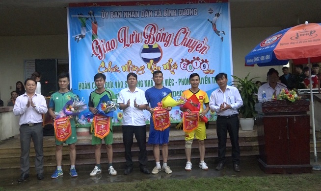 Ảnh: Lãnh đạo xã Bình Dương trao cờ lưu niệm và tặng hoa chúc mừng 4 đội bóng chuyền