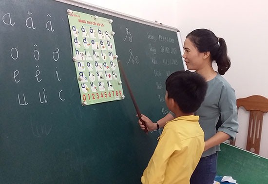 Lớp học tình thương dành cho trẻ khuyết tật đi vào hoạt động vào đầu tháng 11.2018, đến nay có 8 em với những lứa tuổi khác nhau. Từ những buổi học đầu tiên, đến nay các em đã có nhiều tiến bộ. Trung úy Lê Văn Chính - Đội phó Đội vận động quần chúng Đồn Biên phòng Bình Minh - là người đồng hành từ những ngày đầu mở lớp đến nay. Các em trong lớp có hai dạng khuyết tật về trí tuệ và thân thể, lâu nay không được tiếp cận với con chữ nên rất lóng ngóng. Việc phát âm về chữ cái, nhiều em còn chưa rõ. Một lớp học gồm 8 em khuyết tật nhưng phải có 2 giáo viên, một người giảng dạy, người còn lại giữ trật tự. "Để dạy các em bài bản, trước khi mở lớp một tháng, tôi cùng các chị trong Hội LHPN xã gặp trực tiếp các thầy, cô giáo của Trường Mẫu giáo Bình Minh và Tiểu học Nguyễn Văn Cừ để học cách giảng dạy. Sau đó, bản thân cũng mày mò thêm trên internet về cách dạy trẻ khuyết tật. Từ đó giảng dạy phù hợp với các em hơn. Ở đây, chúng tôi không chỉ dạy cho các em con chữ mà còn hướng dẫn kỹ năng sống như sinh hoạt tập thể, hát múa, trang bị cho các em những kiến thức cơ bản trong cuộc sống hàng ngày. Nhiều em tiến bộ rất nhanh" - Trung úy Lê Văn Chính chia sẻ.
