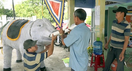(Ảnh: Các nghệ nhân thôn Phước Ấm (Bình Triều) đang tái hiện hình ảnh lịch sử dân tộc qua bàn cộ)