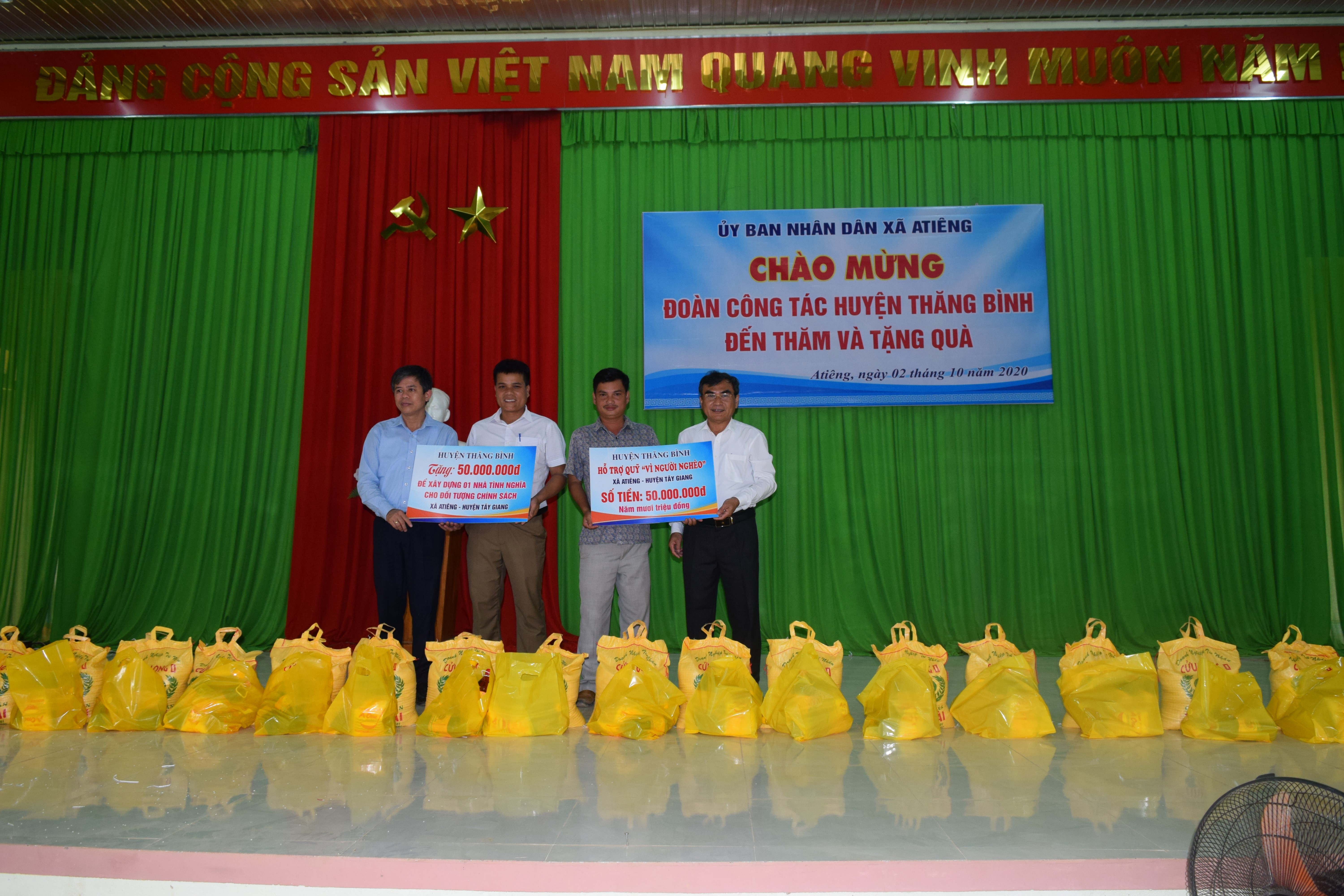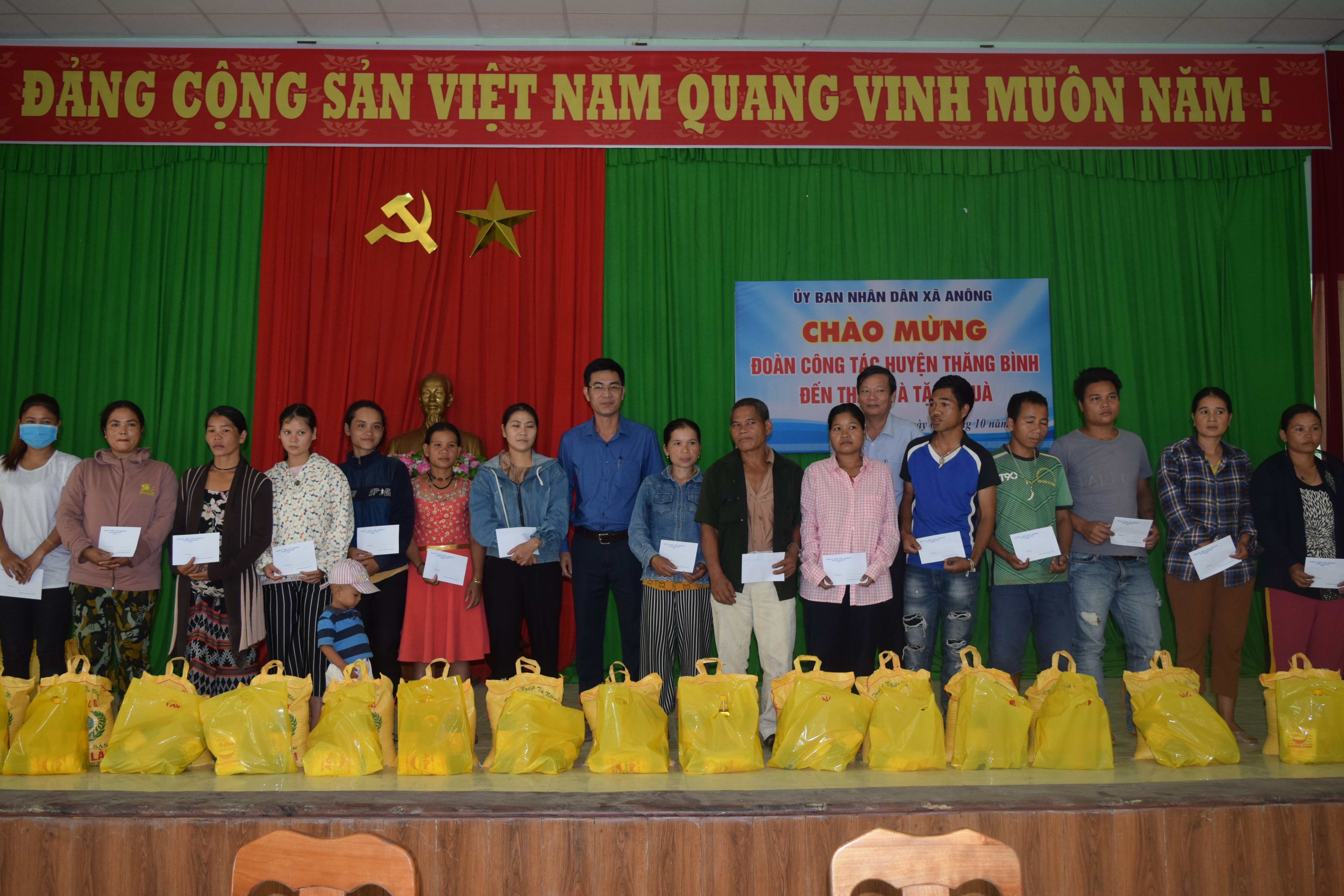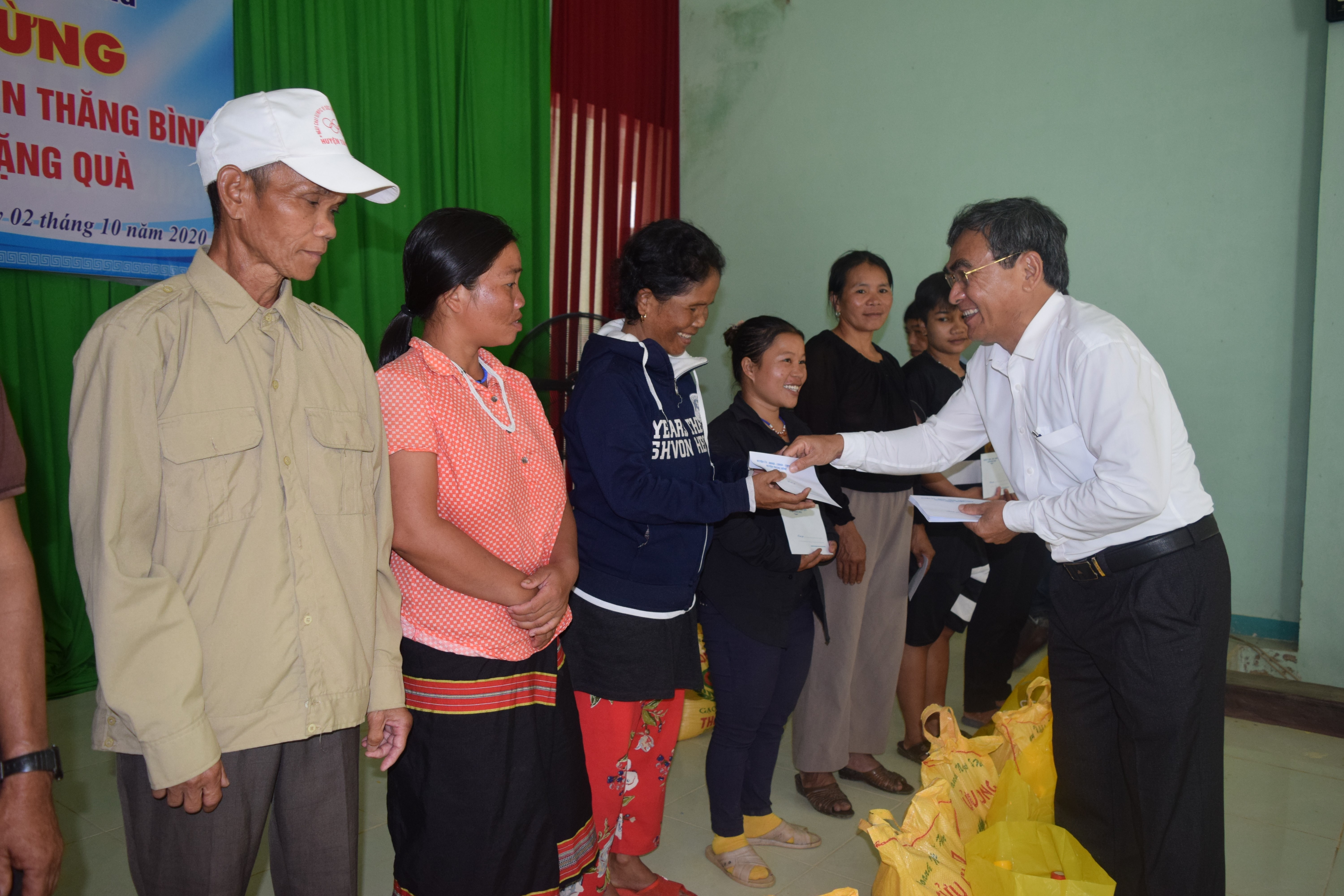 Theo đó, đoàn đã đến thăm và trao 50 suất quà/xã, mỗi suất 500 nghìn đồng bao gồm tiền mặt và các nhu yếu phẩm như gạo, nước mắm, dầu ăn. Lãnh đạo huyện Thăng Bình đã ân cần thăm hỏi, chia sẻ những khó khăn với bà con hai xã A Nông và A Tiêng; đồng thời động viên bà con sớm khắc phục hậu quả để ổn định cuộc sống.