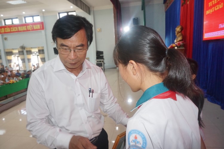 (Ảnh: Ông Hồ Văn Minh- Phó Chủ tịch HĐND huyện tặng giấy khen cho các em)