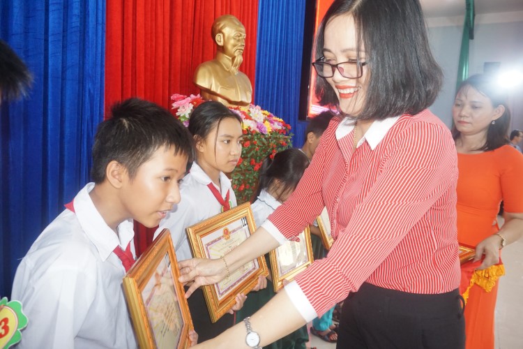 (Ảnh: Bà Phan Thị Nhi - Chủ tịch Ủy ban MTTQ Việt Nam huyện tặng giấy khen cho các em)