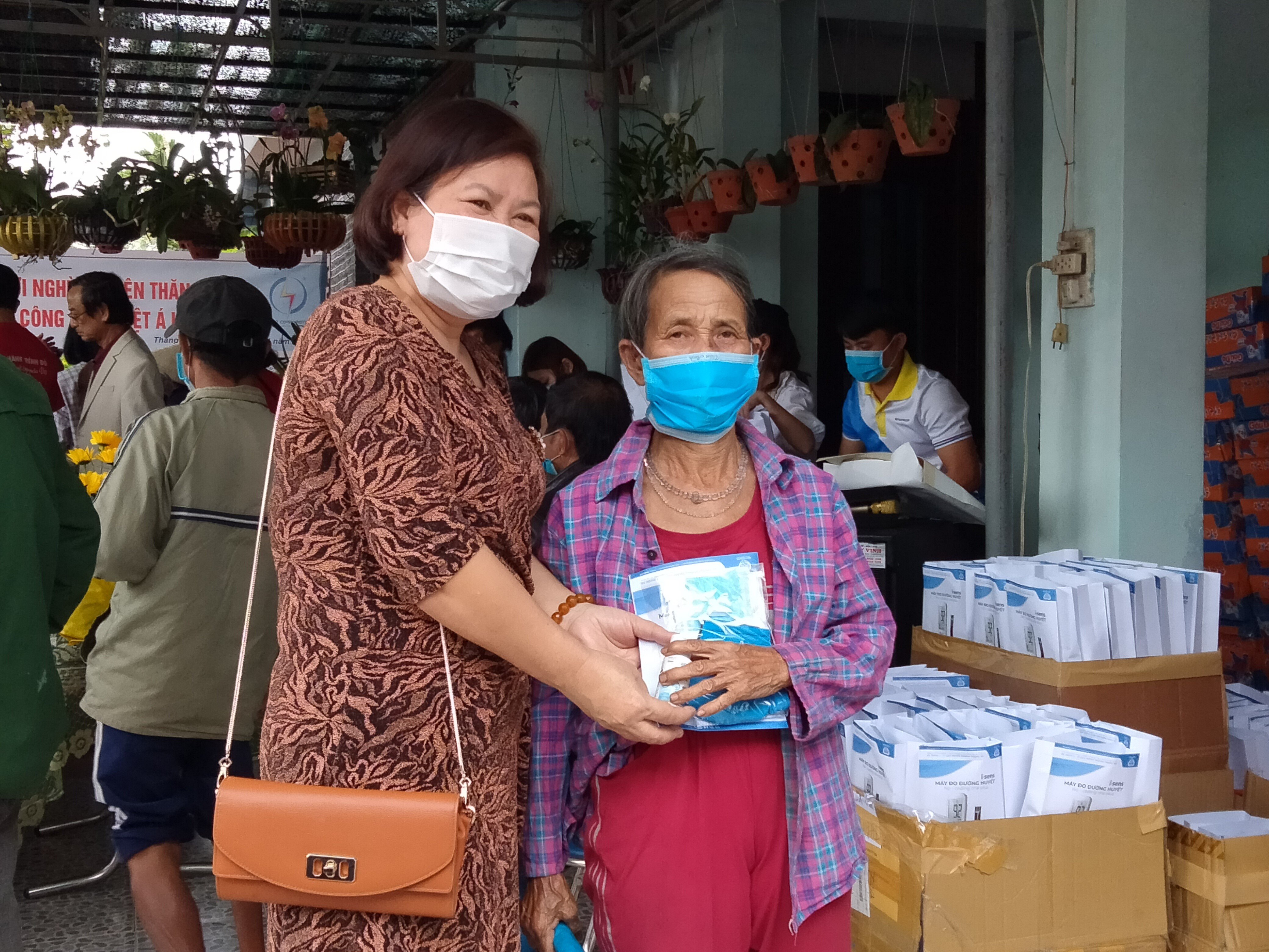 (Ảnh: Ngoài hỗ trợ quà, các đơn vị còn hỗ trợ nước sát khẩn, khẩu trang y tế cho các hộ khó khăn)