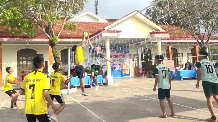 Pha tranh bóng quyết liệt giữa hai đội bóng chuyền Long Hội và Mỹ Trà trong trận khai mạc.