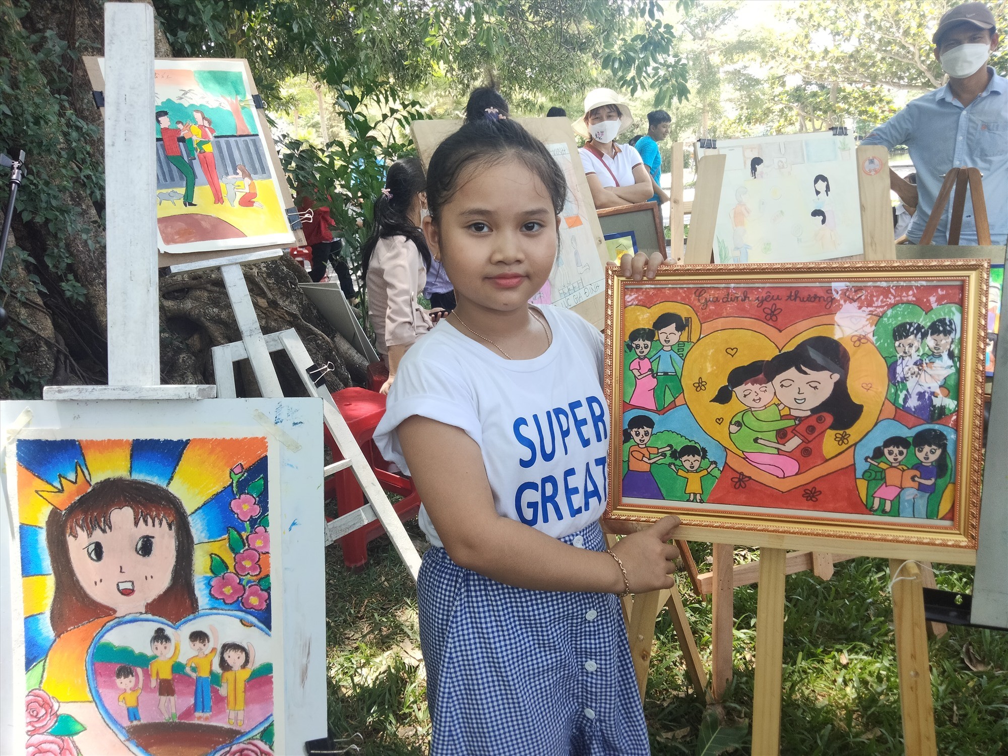 Bạn nhỏ chụp ảnh lưu niệm bên bức tranh do chính mình vẽ