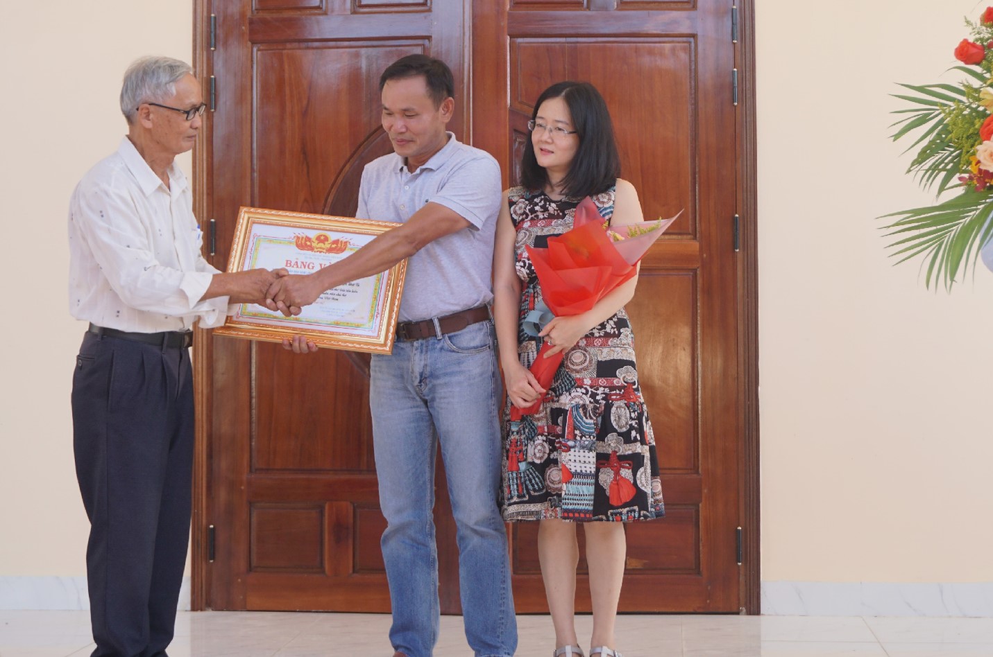Đại diện Ban quản trị làng Cẩm Phú trao giấy khen cho gia đình anh Nguyễn Nhật Vũ.