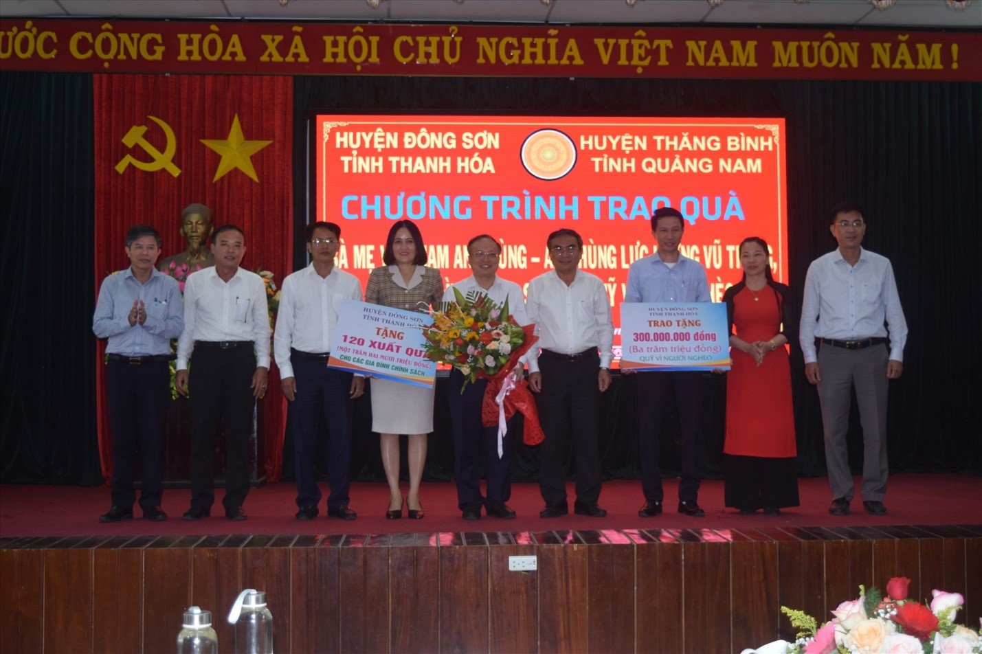 Dịp này, đoàn công tác của huyện Đông Sơn đã trao tặng biểu trưng 300 triệu đồng ủng hộ Quỹ vì người nghèo huyện Thăng Bình.
