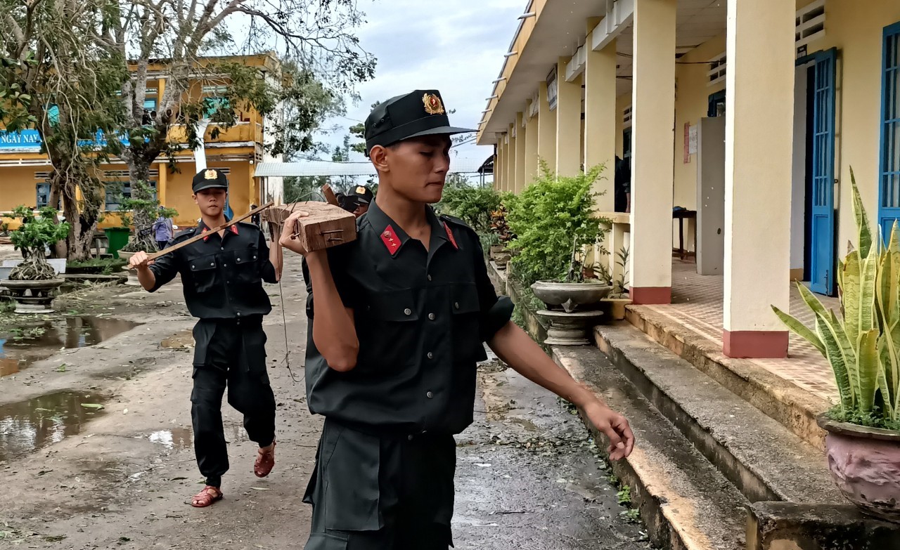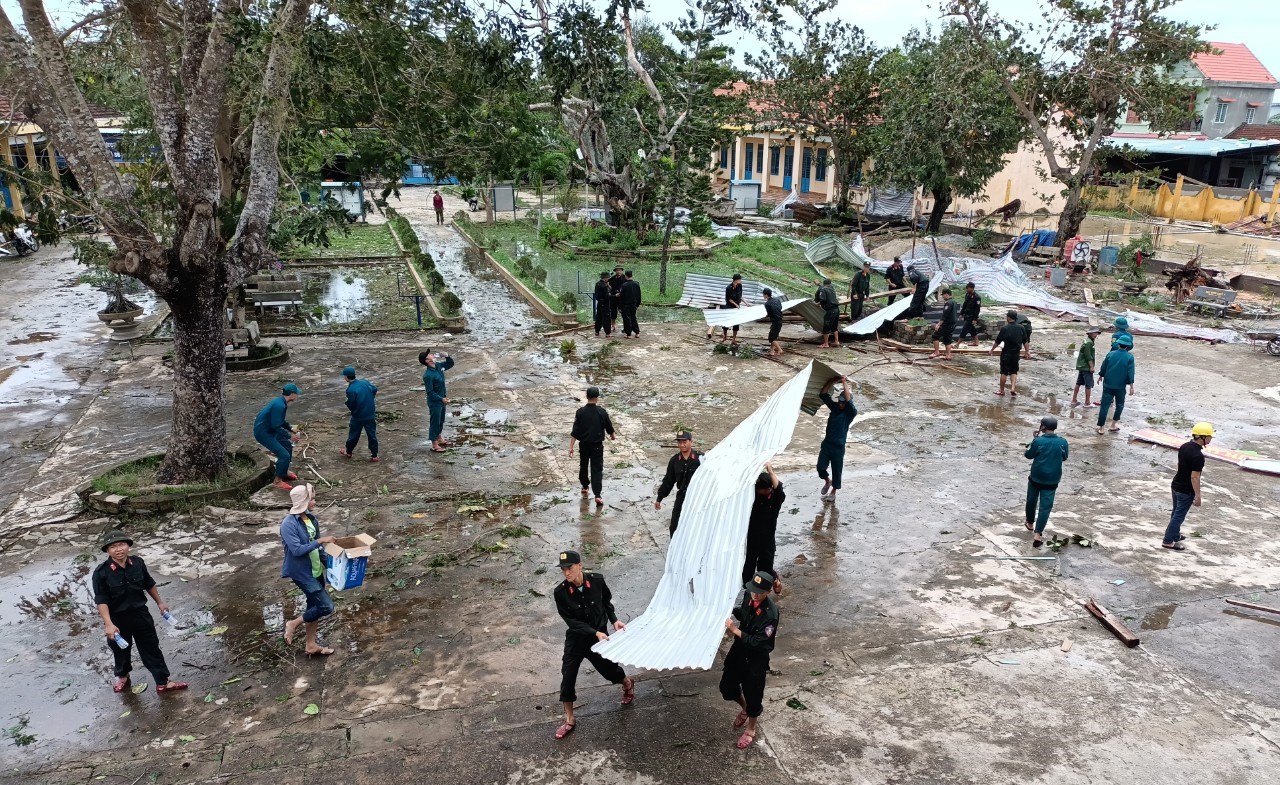 Lực lượng CSCĐ Trung Bộ cùng với dân quân địa phương giúp nhà trường dọn dẹp tôn, cây cối ngã đỗ