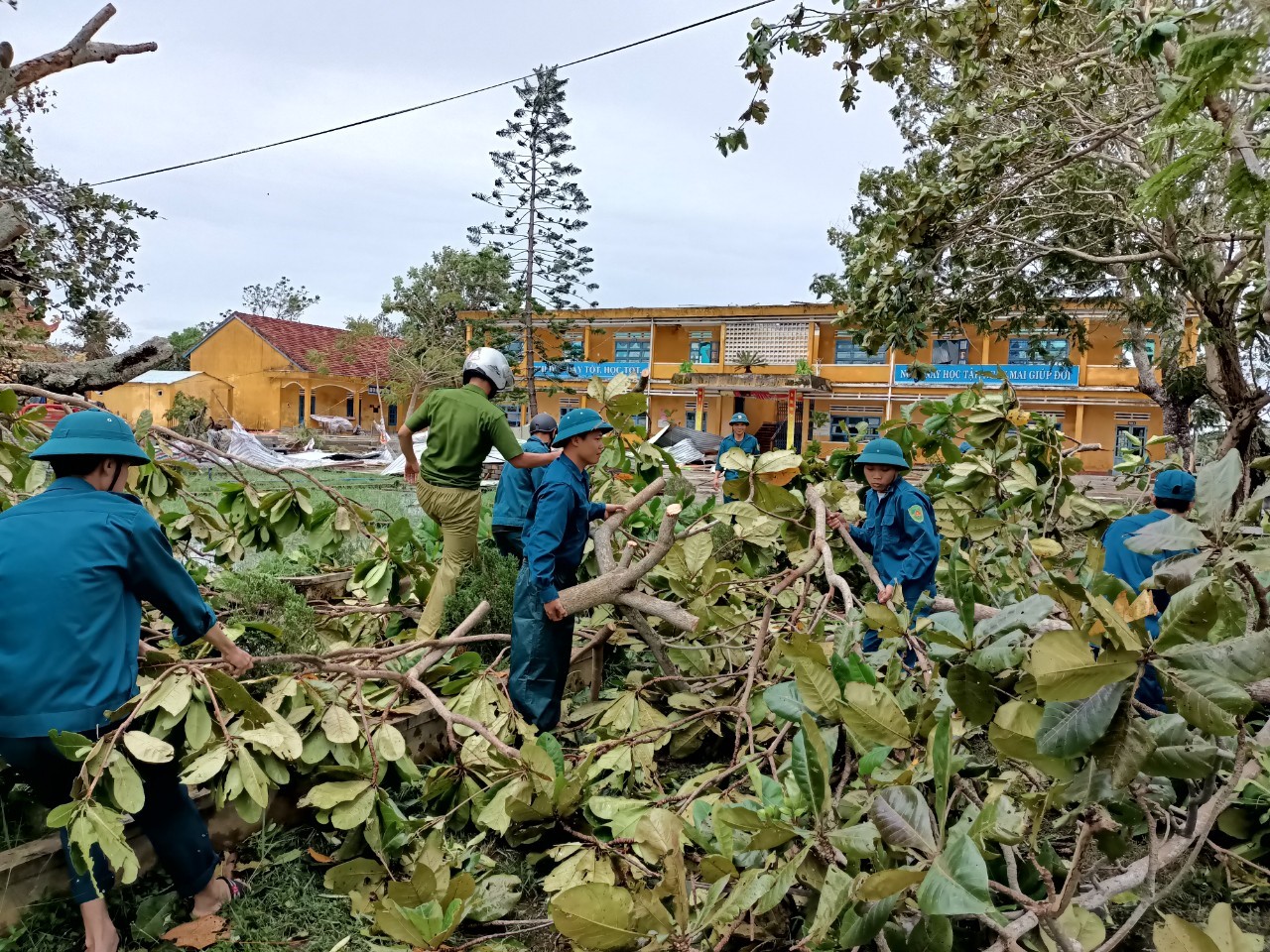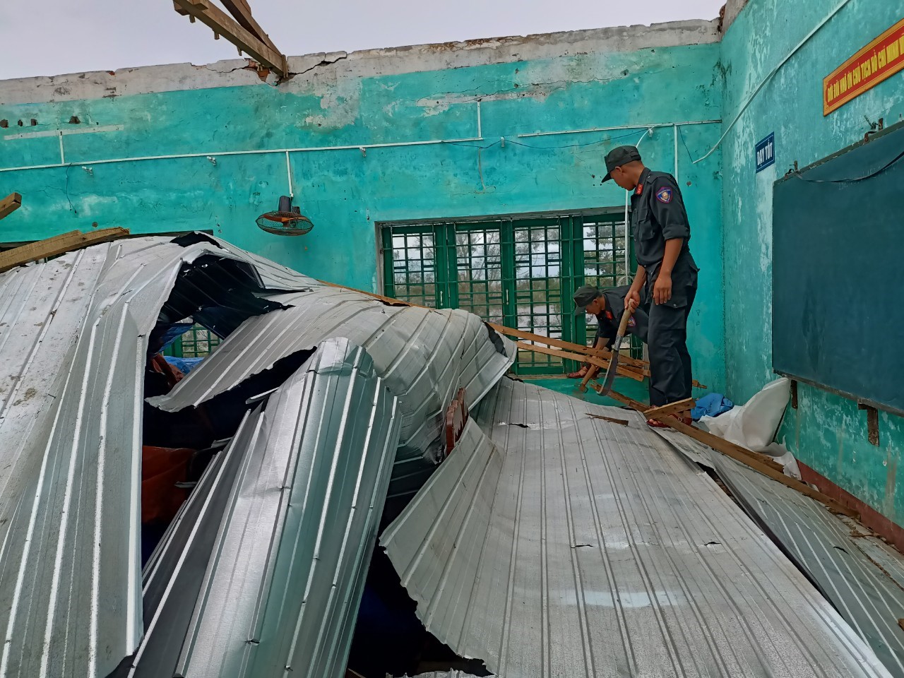 Lực lượng CSCĐ Trung Bộ đã giúp dọn dẹp trường học, cắt tỉa cây bị ngã đổ, di dời máy tính tại phòng tin học của Trường THCS Nguyễn bị tốc mái, hư hỏng.