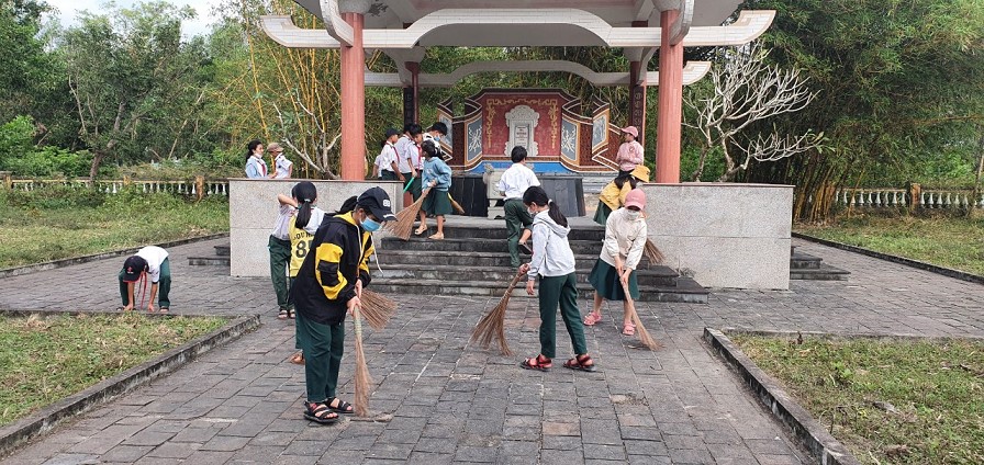 Tại đây, trước khi vào viếng hương, đội viên, đoàn viên và học sinh các trường tham gia quét dọn vệ sinh, trồng hoa chỉnh trang cảnh quan khuôn viên mộ phần.