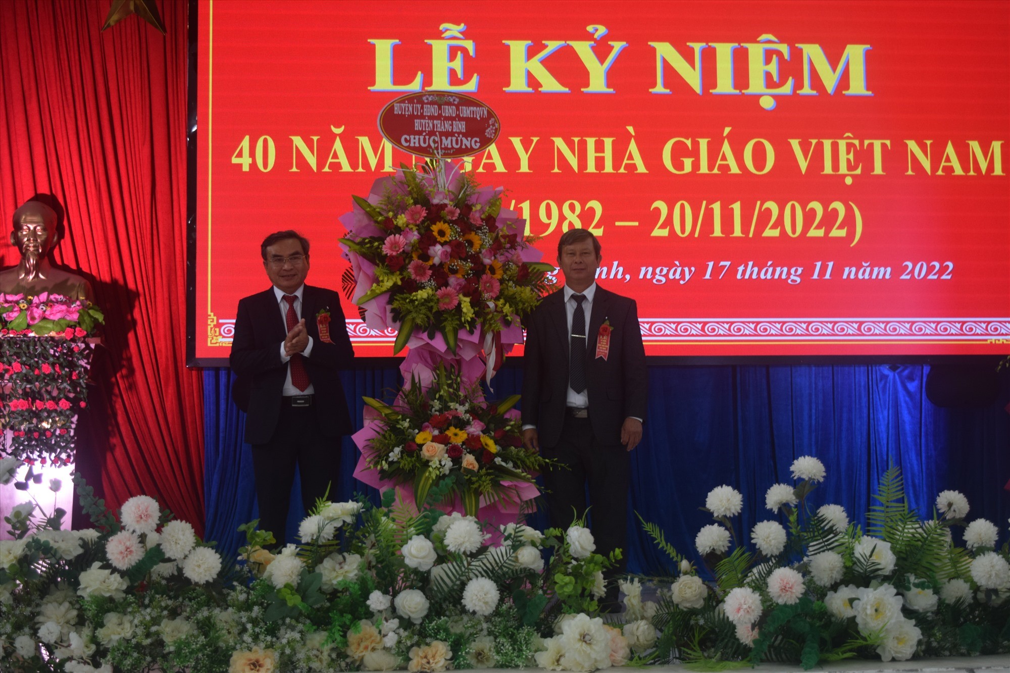 Bí thư Huyện uỷ Thăng Bình Phan Công Vỹ tặng hoa chúc mừng Phòng GD-ĐT huyện.