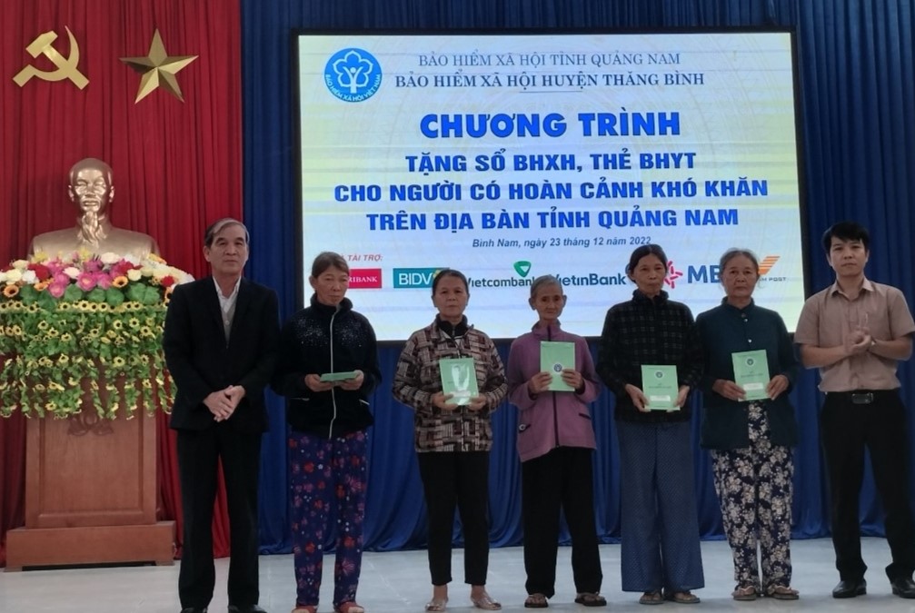 Thực hiện chương tình “Tặng sổ BHXH, thẻ BHYT cho người có hoàn cảnh khó khăn”, BHXH huyện Thăng Bình đã huy động nguồn kinh phí từ cán bộ, nhân viên Ngân hàng, các doanh nghiệp, các nhà hảo tâm đóng góp để tặng cho những trường hợp là hộ gia đình vừa mới thoát nghèo có hoàn cảnh khó khăn, người già cả, người neo đơn. Thời gian hỗ trợ đóng thẻ BHYT từ tháng 12/2022 đến tháng 6/2023.