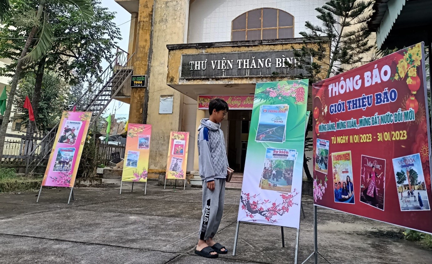 Ngoài việc giới thiệu báo Xuân với nội dung và hình thức phong phú, Thư viện còn trưng bày sách trong tủ kính theo nhiều chủ đề như Đảng quang vinh, Bác Hồ vĩ đại, về quê hương Thăng Bình như: Lịch sử Đảng bộ huyện Thăng Bình (1930- 1975); Thăng Bình - những tập thể, cá nhân anh hùng lực lượng vũ trang nhân dân; Văn nghệ dân gian Thăng Bình; Danh nhân Thăng Bình; Bia Văn thánh và các văn bia Hán Nôm tại huyện Thăng Bình; Phật viện Đồng Dương; Hà Đình Nguyễn Thuật - Danh nhân văn hóa, Thăng Bình xuân đổi mới 2023…