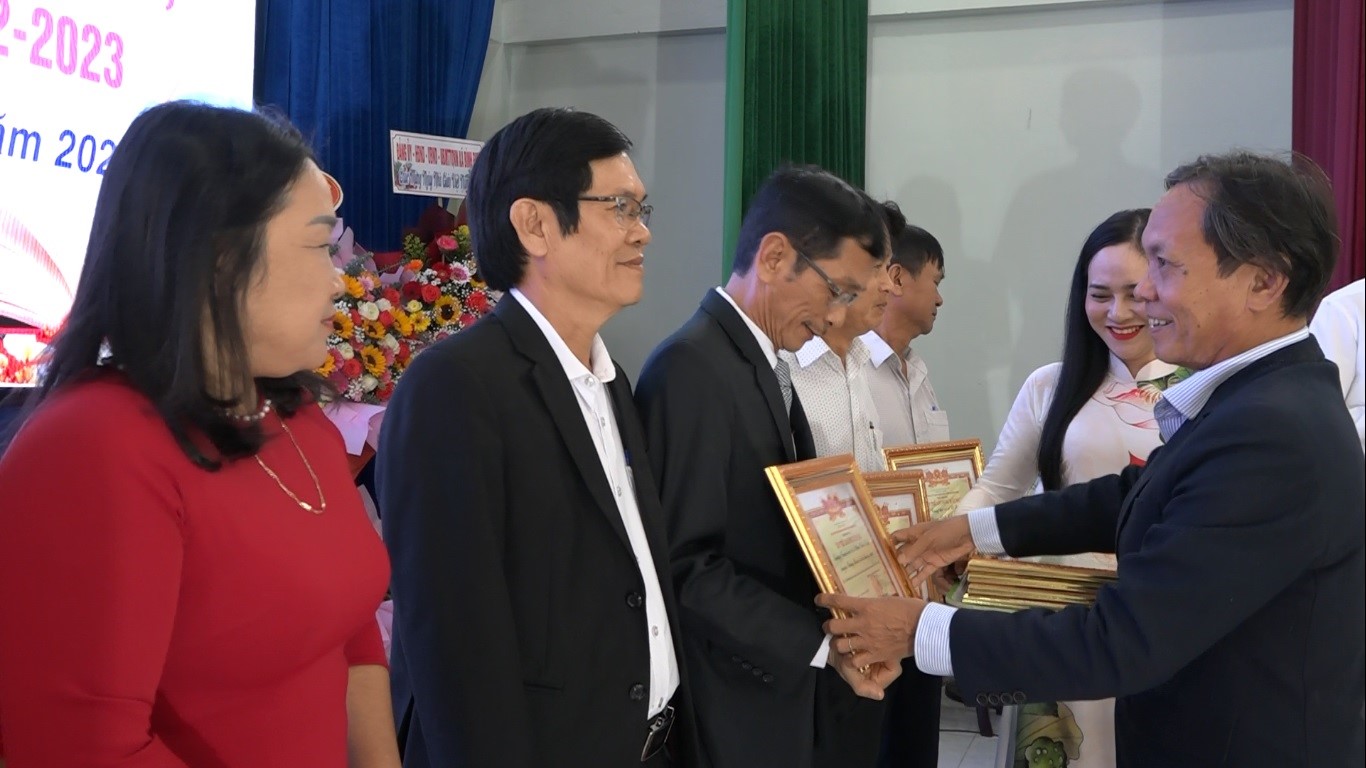 Phó Chủ tịch HĐND huyện Hồ Văn Minh trao bằng khen của UBND tỉnh cho 7 tập thể hoàn thành xuất sắc nhiệm vụ từ năm học 2021 – 2022 đến năm học 2022 - 2023