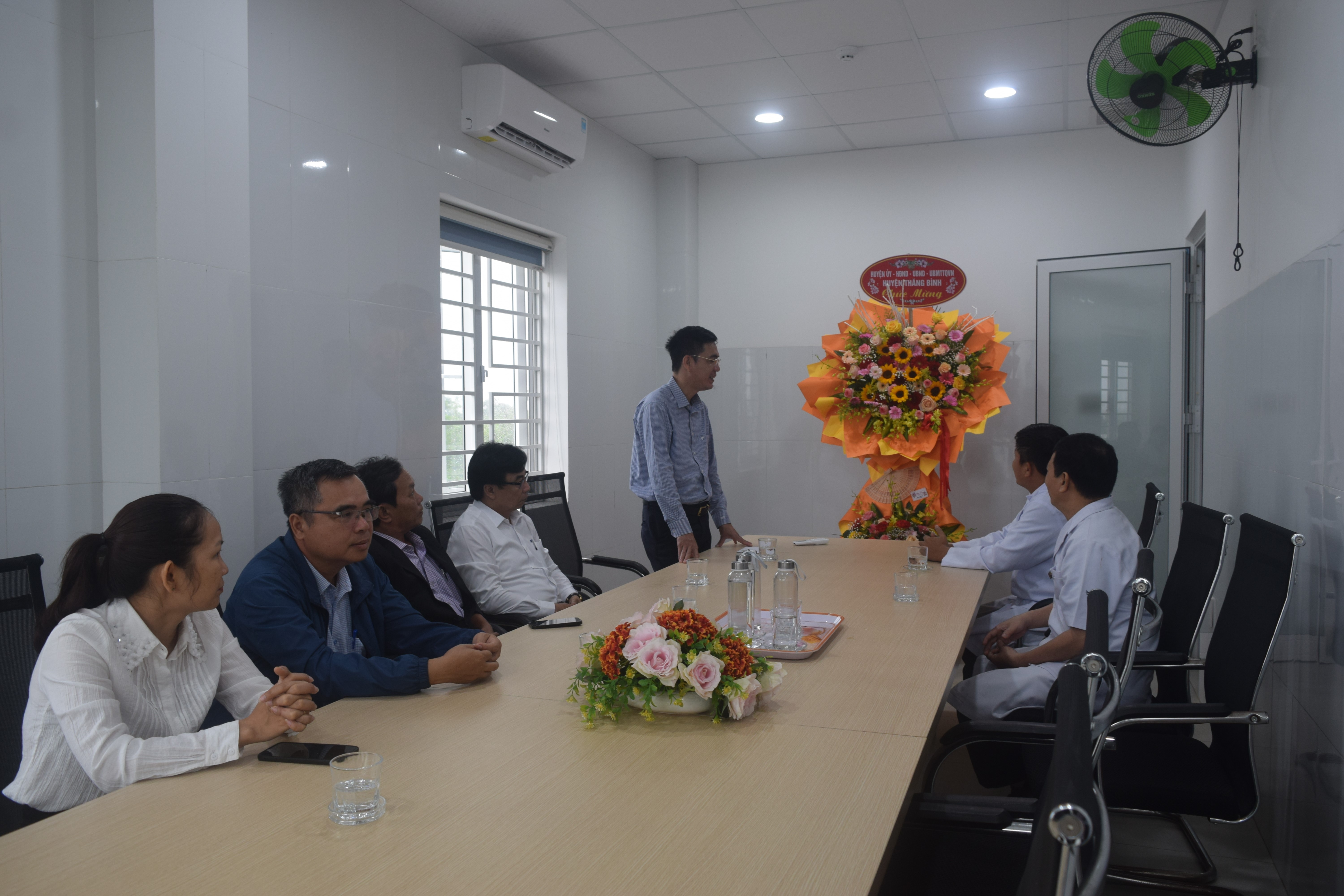 Đồng chí Nguyễn Đức Bình - Phó Bí thư Huyện ủy và lãnh đạo huyện tặng hoa chúc mừng Trung tâm Y tế huyện