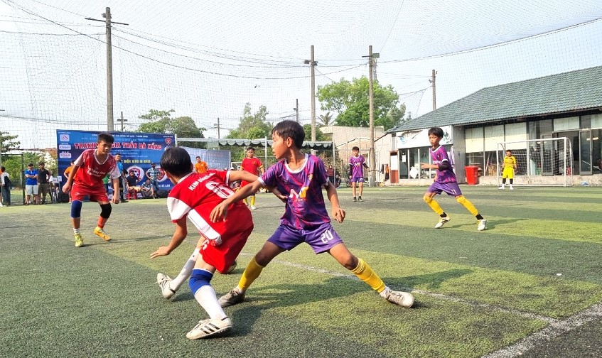 (Pha tranh bóng giữa các cầu thủ U12 Kim Đồng Hà Lam và Sunday Hội An)