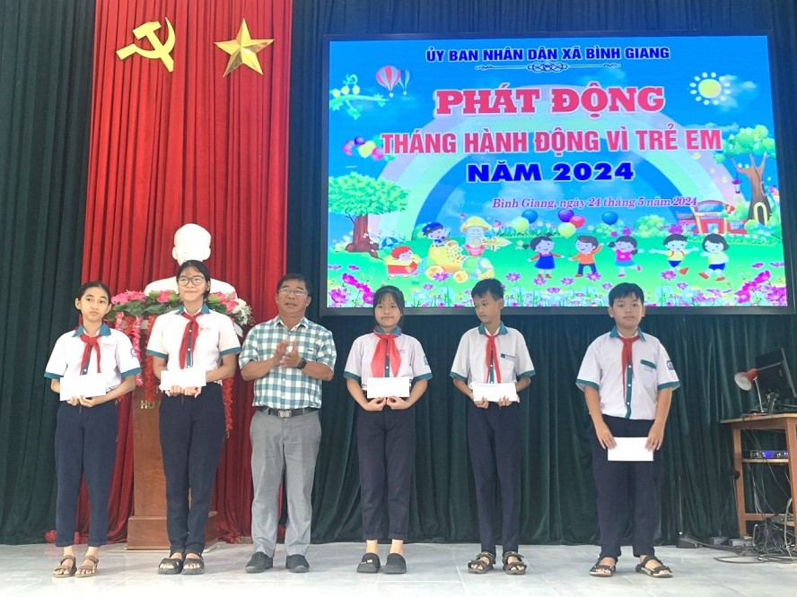 Dịp này, UBND xã Bình Giang đã trao 14 phần quà, mỗi suất 300.000đ cho các em học sinh có hoàn cảnh khó khăn trên địa bàn xã.