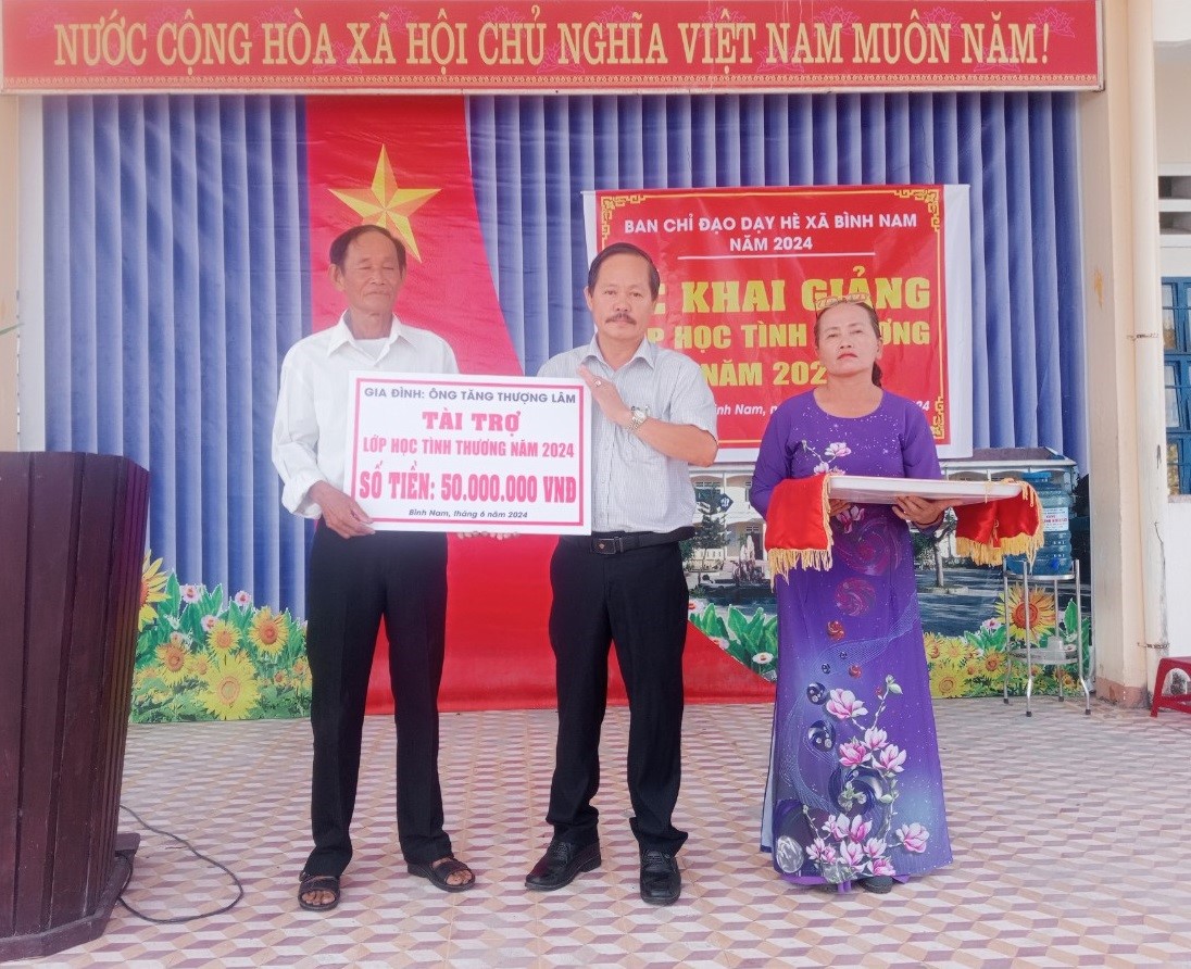 Dịp này, cá nhân ông Tăng Thượng Lâm, người con quê hương hiện đang sinh sống ở thành phố Hồ Chí Minh đóng góp 50 triệu đồng hỗ trợ cùng chính quyền xã Bình Nam tổ chức lớp học tình thương hè năm 2024.