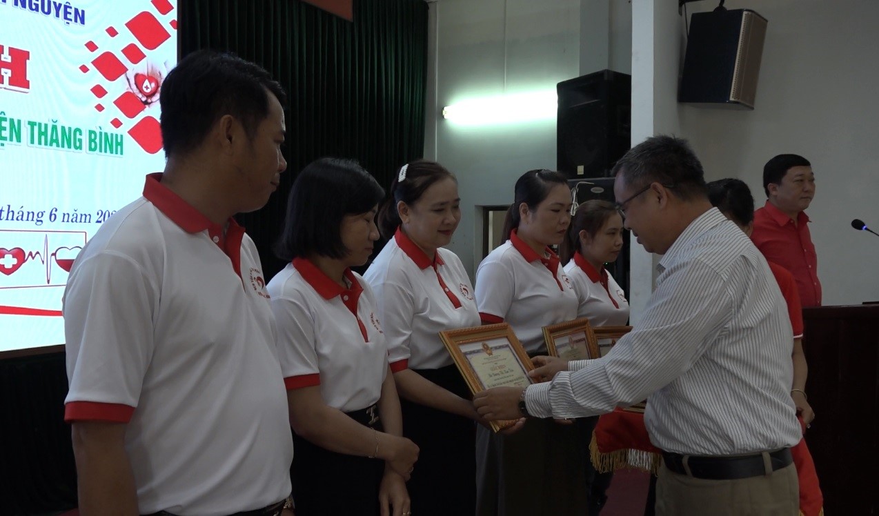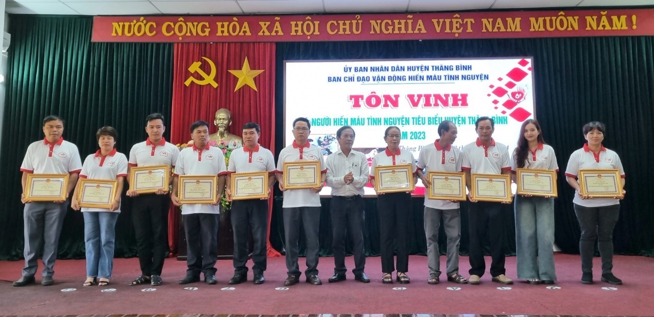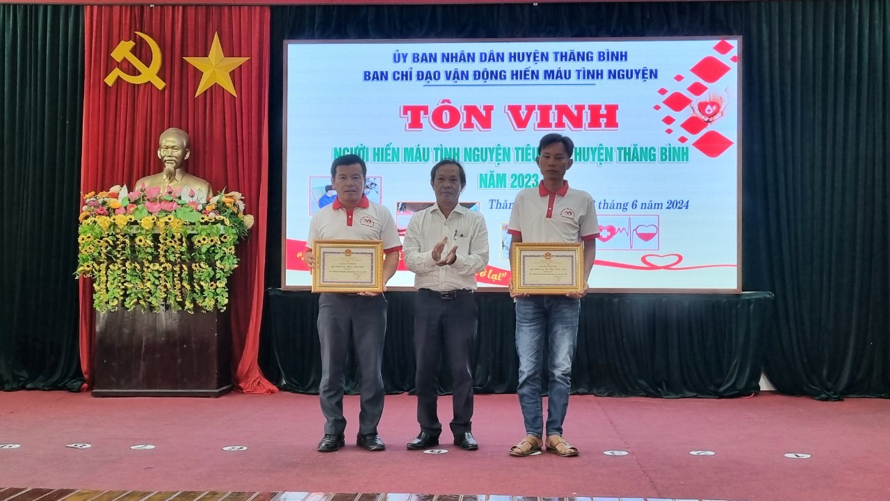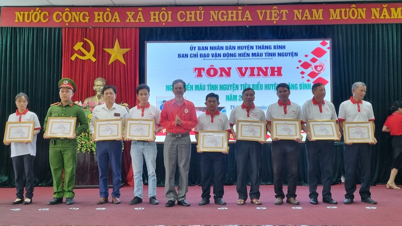 Tại chương trình, UBND huyện Thăng Bình đã tôn vinh, khen thưởng cho 2 gia đình và 54 cá nhân tiêu biểu có số lần hiến máu từ 10 - 14 lần. Đồng thời ghi nhận và biểu dương 14 tình nguyện viên tiêu biểu hiến máu tình nguyện được UBND tỉnh khen thưởng.