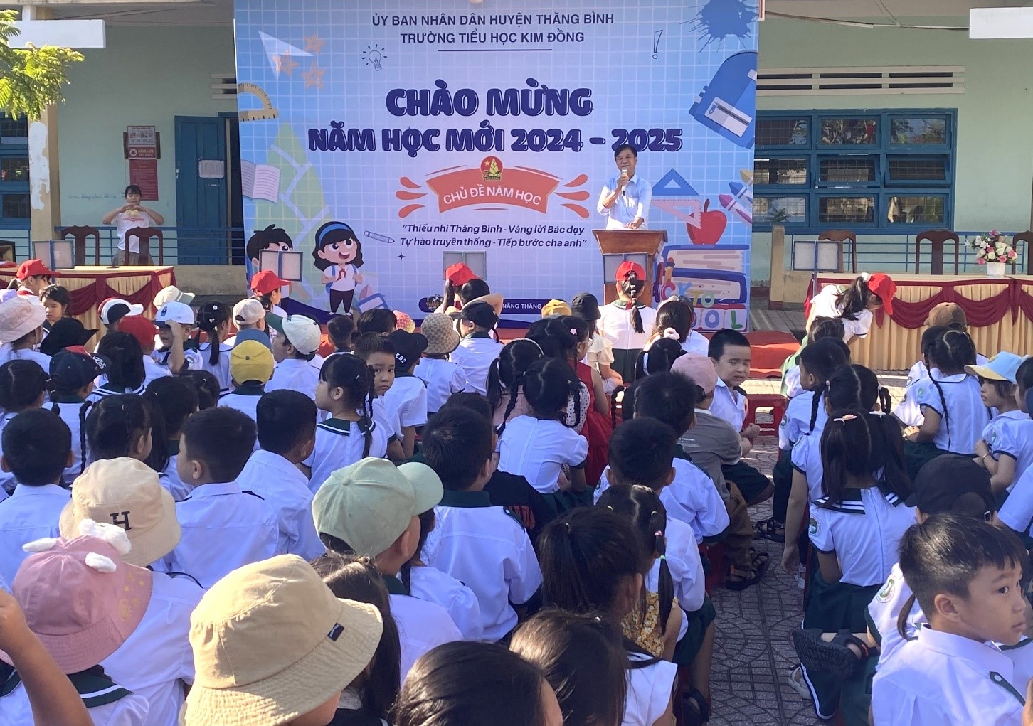 Tại Trường Tiểu học Kim Đồng (TT.Hà Lam), trong sáng 22/8, sau thời gian tập trung, chào đón học sinh lớp 1 ở sân trường. Các học sinh được các giáo viên hướng dẫn đi về lớp. Các giáo viên chủ nhiệm chia sẻ với các học sinh về nội quy, nền nếp của lớp sau đó sẽ đưa các em đi vòng quanh trường, tham quan các phòng học, phòng chức năng, khu vực vệ sinh, khu vui chơi trong sân trường để học sinh lớp 1 thêm hiểu về ngôi trường mình sẽ học. Năm học 2024-2025, toàn trường có 811 học sinh, trong đó có 152 em học sinh lớp 1.