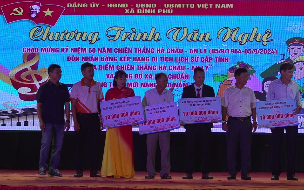 Thông qua chương trình văn nghệ này, xã Bình Phú cũng đã kêu gọi và vận động được 100 triệu đồng xây dựng nhà bia “Di tích lịch sử chiến thắng Hà Châu – An Lý”. Ngoài ra, địa phương cũng đã trao 30 suất quà cho các gia đình có công cách mạng trên địa bàn xã, mỗi suất 1 triệu đồng.