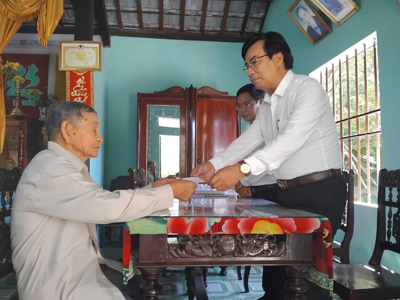 Lãnh đạo huyện thăm ông Trần Đức ( xã Bình Phục) là nhân chứng trực tiếp tham gia Cuộc đấu tranh Hà Lam- Chợ Được