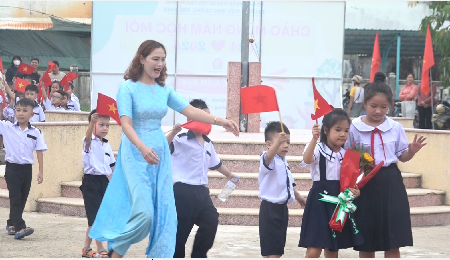 Các em học sinh lớp 5 cùng các cô giáo đón, dẫn dắt các em học sinh lớp 1 tựu trường