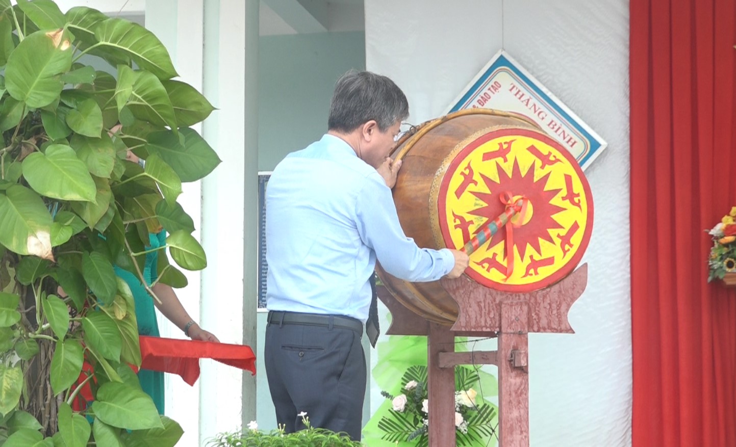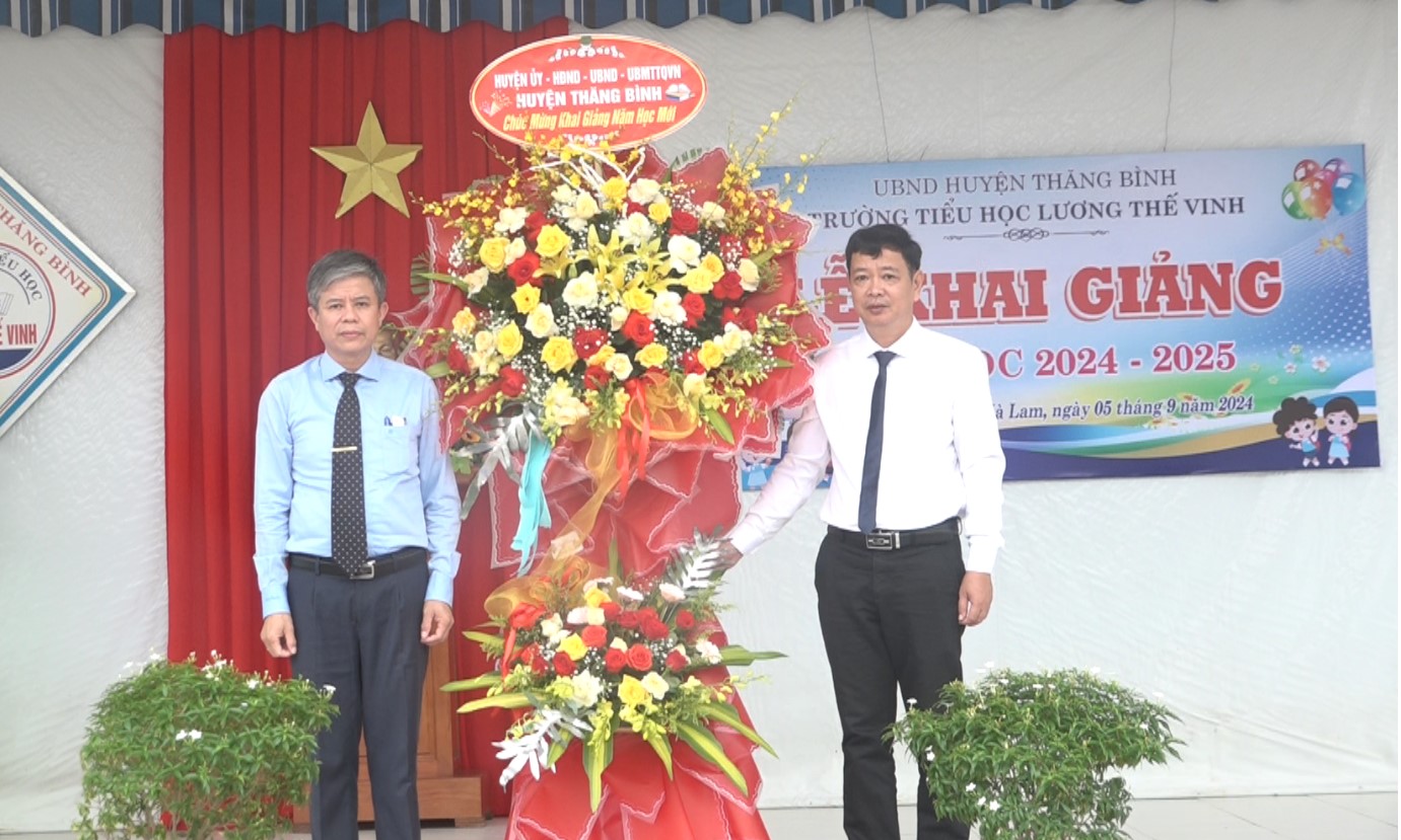 Phó Bí thư, Chủ tịch UBND huyện Thăng Bình Võ Văn Hùng tặng hoa, đánh trống tựu trường