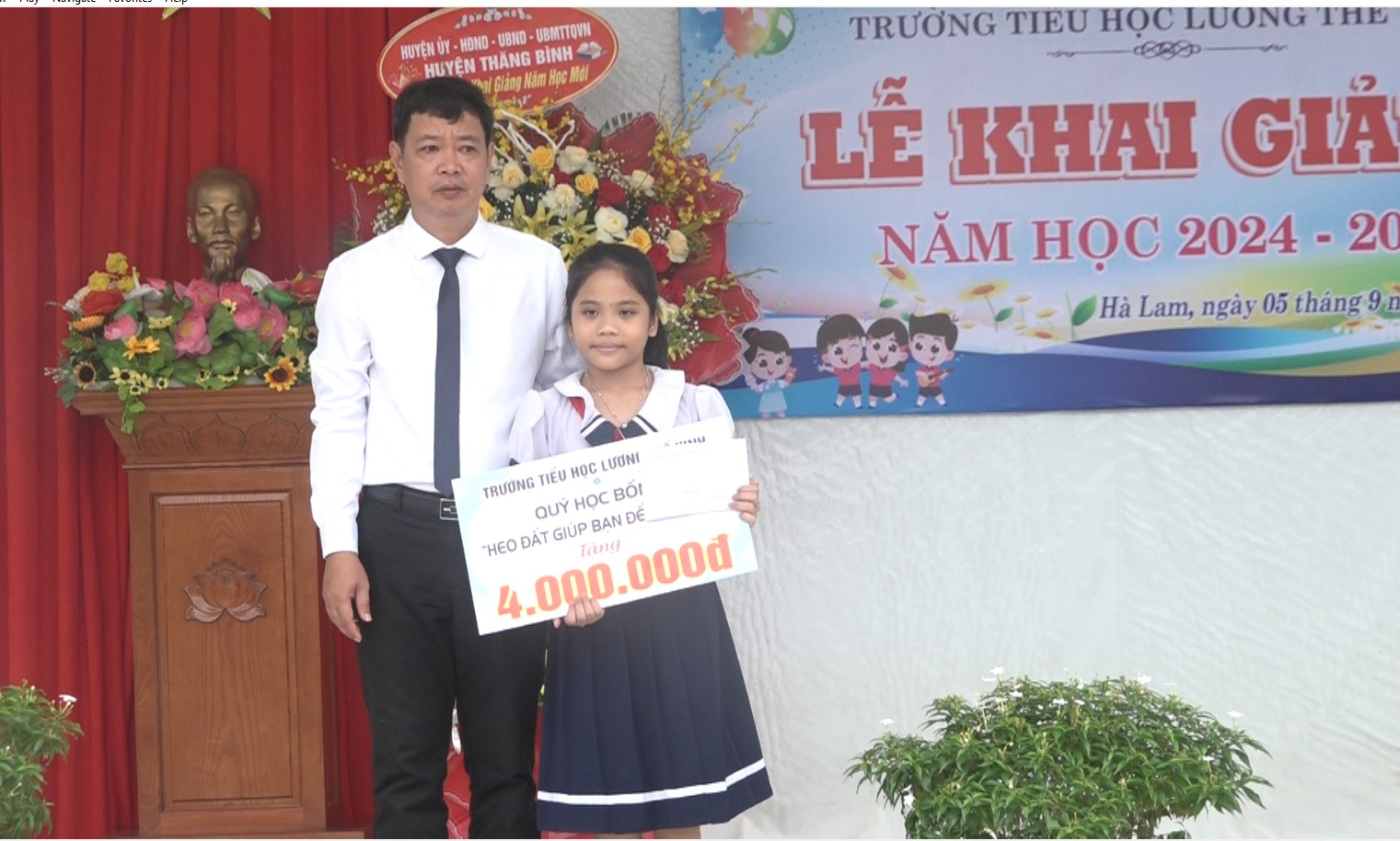 Nhân lễ khai giảng năm học mới, Trường TH Lương Thế Vinh đã tặng 20 suất quà, trong đó có 1 suất trị giá 4 triệu đồng, còn lại 300.000 đồng/suất cho các em học sinh khó khăn được trích từ nguồn heo đất giúp bạn đến trường.