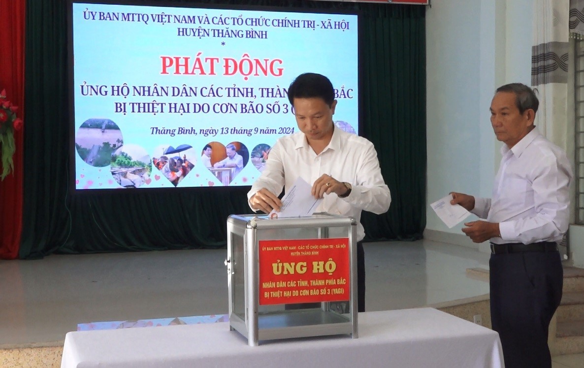 Hưởng ứng Lời kêu gọi của Đoàn Chủ tịch Ủy ban Trung ương MTTQ Việt Nam, Ủy ban MTTQ Việt Nam huyện Thăng Bình và Ủy ban MTTQ Việt Nam xã các xã, thị trấn đã có Thư kêu gọi ủng hộ đồng bào bị thiệt hại do bão số 3 và lũ lụt gây ra. Từ sự kêu gọi này, thông qua Ủy ban MTTQ Việt Nam huyện Thăng Bình, nhiều cơ quan, đơn vị, doanh nghiệp, doanh nhân, cá nhân trong và ngoài huyện đã chung tay hỗ trợ người dân các tỉnh phía Bắc. Theo thống kê Ủy ban MTTQ Việt Nam huyện Thăng Bình, tính đến 18 giờ ngày 16/9, các cơ quan, đơn vị, doanh nghiệp, tổ chức, cá nhân đã ủng hộ đồng bào miền Bắc bị thiệt hại do bão, lũ trên 1,02 tỷ đồng. Ủy ban MTTQ Việt Nam huyện sẽ tiếp nhận các sự ủng hộ đến hết ngày 10/10/2024.