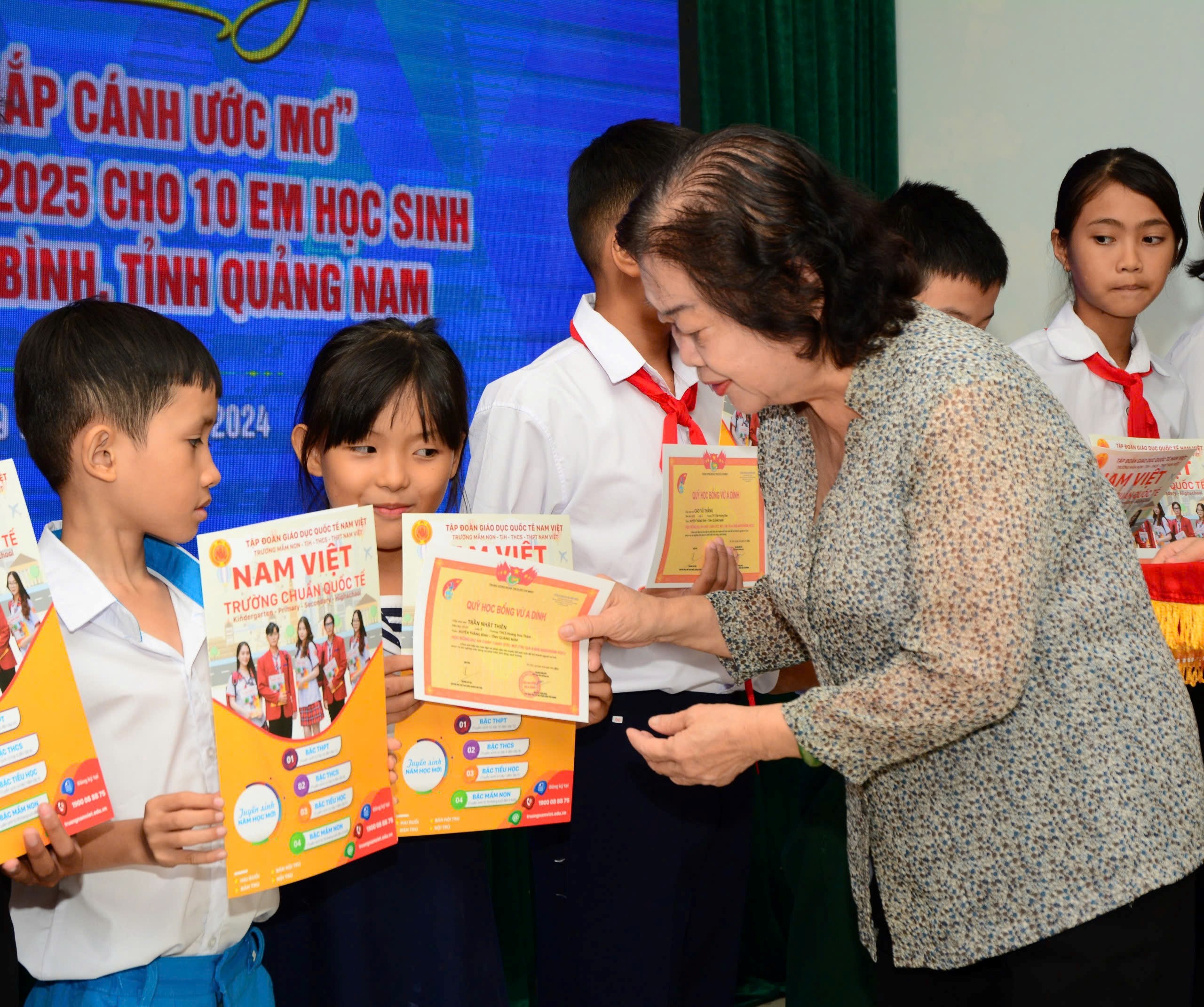 Bà Trương Mỹ Hoa- Nguyên Bí thư Trung ương Đảng, Nguyên Phó chủ tịch nước Cộng hoà xã hội chủ nghĩa Việt Nam, Chủ tịch Quỹ học bổng Vừ A Dính, Chủ nhiệm CLB “ Vì Hoàng Sa – Trường Sa thân yêu” nhấn mạnh, đến thời điểm hiện tại Dự án “ Chắp cánh ước mơ” đang hỗ trợ học tập cho 528 em học sinh trên cả nước, trong đó có nhiều em ở vùng bị bão lũ số 3 vừa qua. Riêng đối Quảng Nam, dự án hỗ trợ 51 em. Hiện tại nguồn quỹ dự án khoảng 380 tỷ đồng với 22 nhà tài trợ chiến lược sẽ ký kết đồng hành cùng với các em đến năm 2028. Do đó mong muốn các em có thêm điều kiện để đến trường học tập tốt hơn.