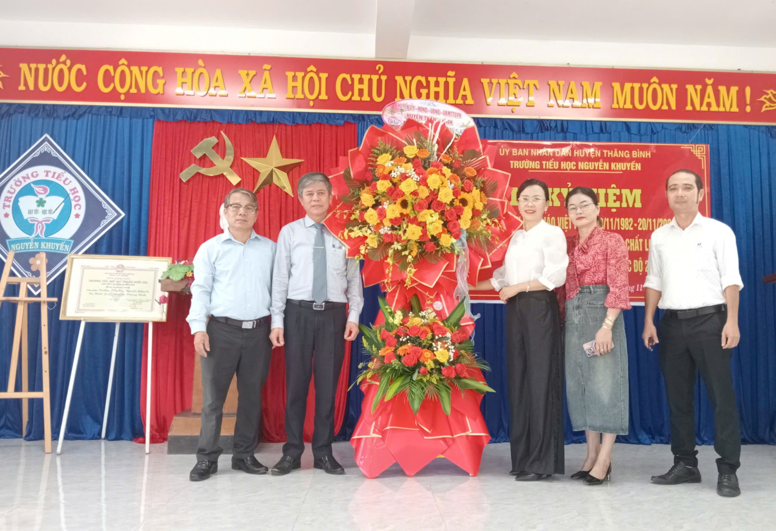 Chủ tịch UBND huyện Võ Văn Hùng tặng hoa chúc mừng trường Tiểu học Nguyễn Kkuyến