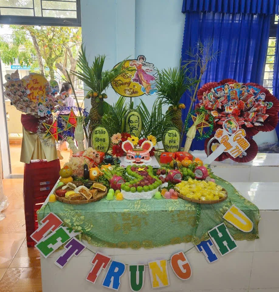 Hàng trăm gương mặt rạng ngời xúm xít khắp sân trường, biến không gian thành lễ hội lung linh sắc màu. Các em hóa thân Chú Cuội ngây ngô bên gốc đa, Chị Hằng e ấp giữa cung Quảng Hàn; những bộ trang phục rực rỡ sáng tạo dưới muôn vàn ánh đèn lồng treo lủng lẳng. Tiếng cười giòn tan vang lên từ Cuộc thi làm “Mâm cỗ Trung thu”, nơi bánh dẻo, bánh nướng được khéo léo tạo hình thành những kiệt tác sum vầy. Hội thi “Làm lồng đèn” mang đến không khí rộn ràng với những chiếc đèn kéo quân lung linh chuyển động như dòng sông ánh sáng đêm thu. Cuộc thi “Tìm hiểu phong tục Trung thu” lại thì thầm kể chuyện về Tết đoàn viên – biểu tượng của yêu thương, sẻ chia và lòng nhân ái.