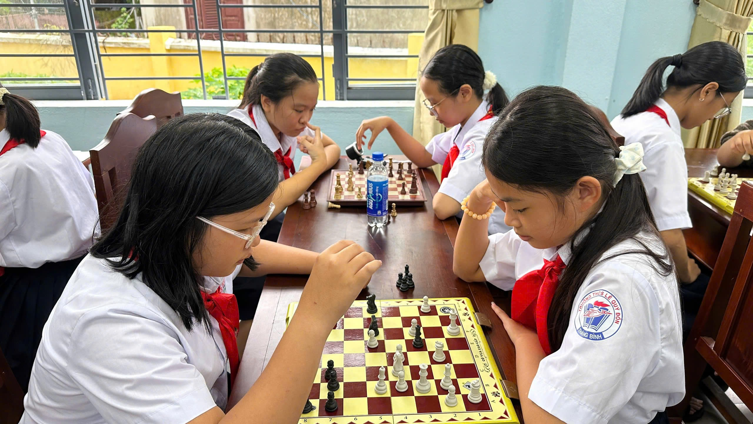 (Học sinh thi đấu môn cờ Vua tại Hội khỏe Phù Đổng cấp trường)