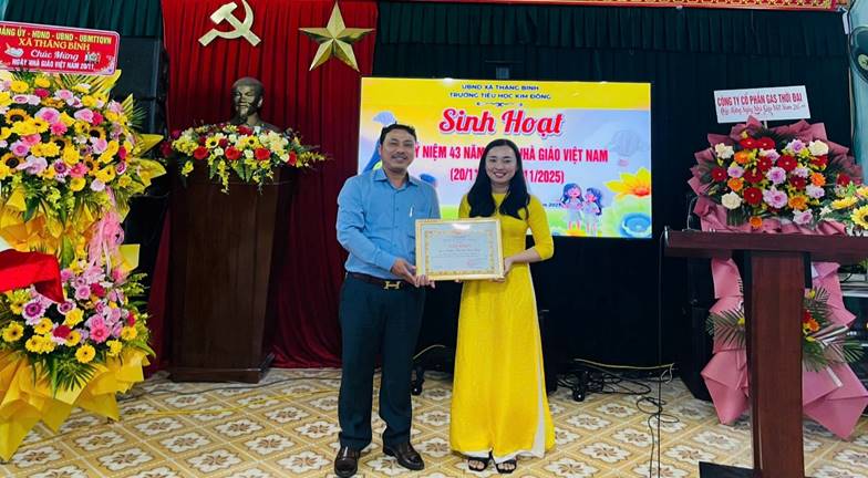 (Lãnh đạo xã tặng Giấy khen cho tập thể Trường Tiểu học Kim Đồng)