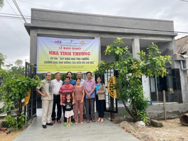 (Ảnh: Ông Nguyễn Hữu Hiệp (đứng đầu từ trái) cùng Hội Khuyến học huyện trong Lễ bàn giao “Nhà tình thương”)