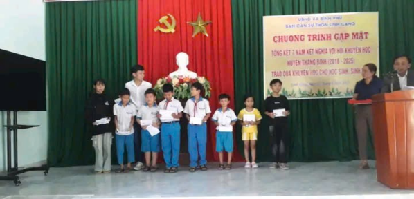 (Ảnh: Ông Nguyễn Hữu Hiệp trao quà khuyến học cho học sinh, sinh viên tại chương trình gặp mặt ở thôn Linh Cang)