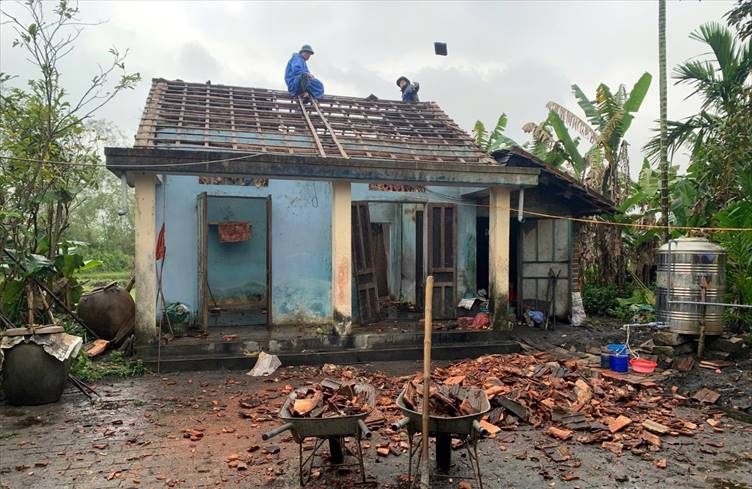 (Lực lượng dân quân xã Thăng Bình ra quân hỗ trợ tháo dỡ, sửa chữa nhà cho hộ Bà Phan Thị Cúc)