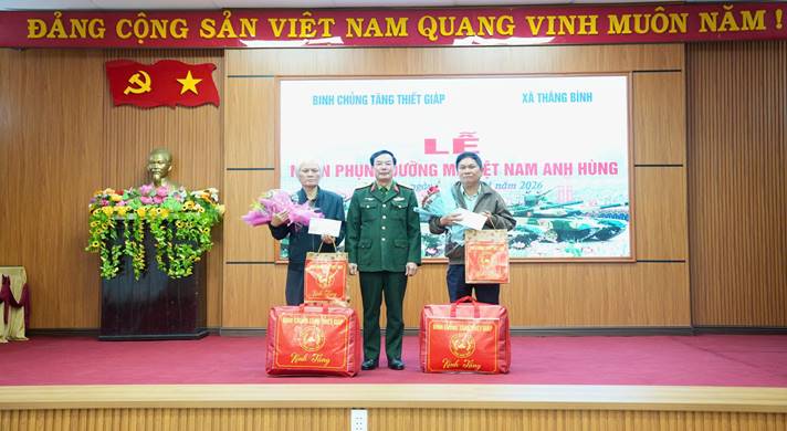Đợt này, Bộ Tư lệnh Binh chủng Tăng thiết giáp nhận phụng dưỡng 02 Mẹ Việt Nam Anh hùng đang sinh sống trên địa bàn xã Thăng Bình: Mẹ Nguyễn Thị Tám ở thôn 1, có 2 con là liệt sĩ và mẹ Nguyễn Thị Thắm ở thôn 8, có chồng và con là liệt sĩ, mức phụng dưỡng 1.500.000 đồng/tháng/mẹ, do các đơn vị trực thuộc gồm Xưởng sửa chữa Tăng thiết giáp X32 và Tiểu đoàn vận tải D987 Cục Hậu cần - Kỹ thuật thực hiện từ tháng 01 năm 2026