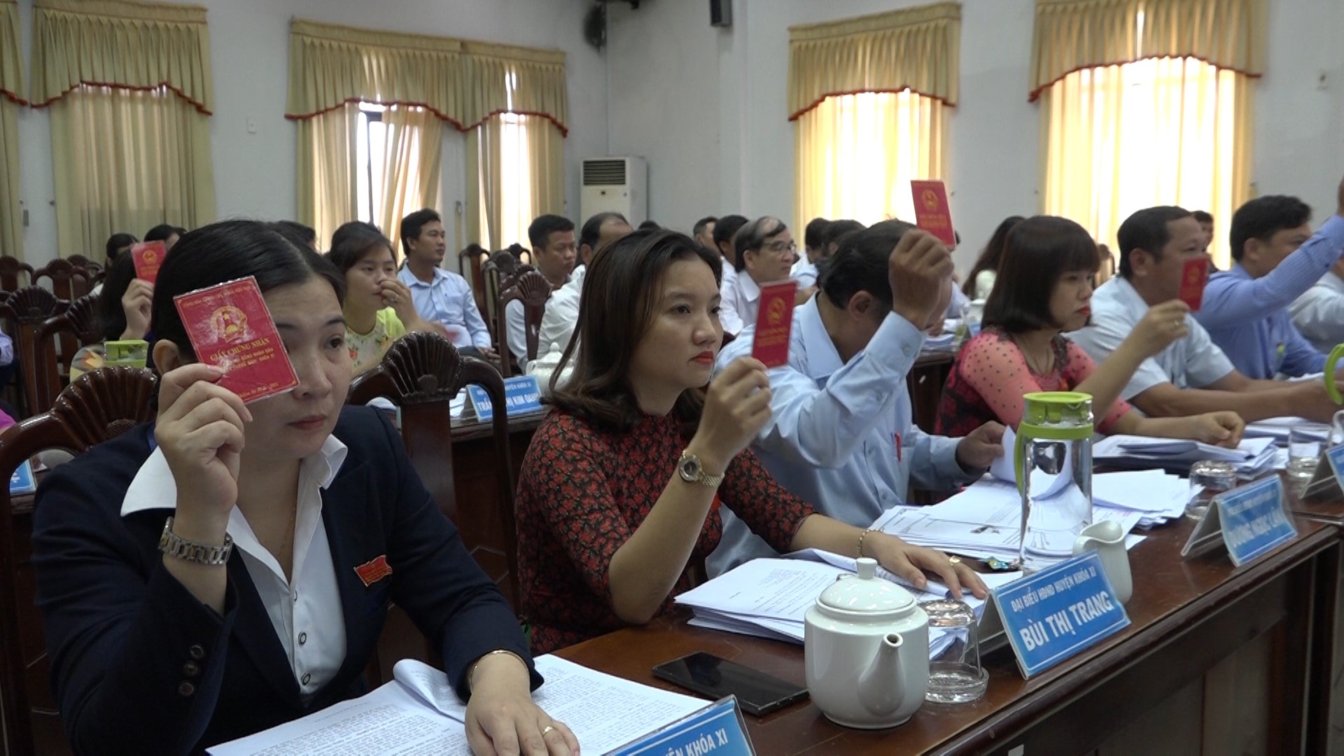 (Ảnh: Các đại biểu HĐND huyện biểu quyết thông qua các Nghị quyết)