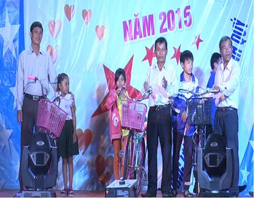 Ảnh: Lãnh đạo xã Bình Quý tặng xe đạp cho các em học sinh.