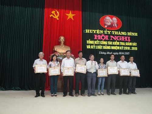 Dịp này, Ban Thường vụ Huyện ủy tặng giấy khen cho 6 tập thể và 9 cá nhân hoàn thành tốt nhiệm vụ kiểm tra, giám sát nhiệm kỳ 2010-2015. Trước đó, Ban Thường vụ Huyện ủy đã tổ chức Lễ trao tặng Huy hiệu 65 năm tuổi đảng cho Đ/c Lê Văn Minh, đảng viên chi bộ 15, Đảng bộ Thị trấn Hà Lam.