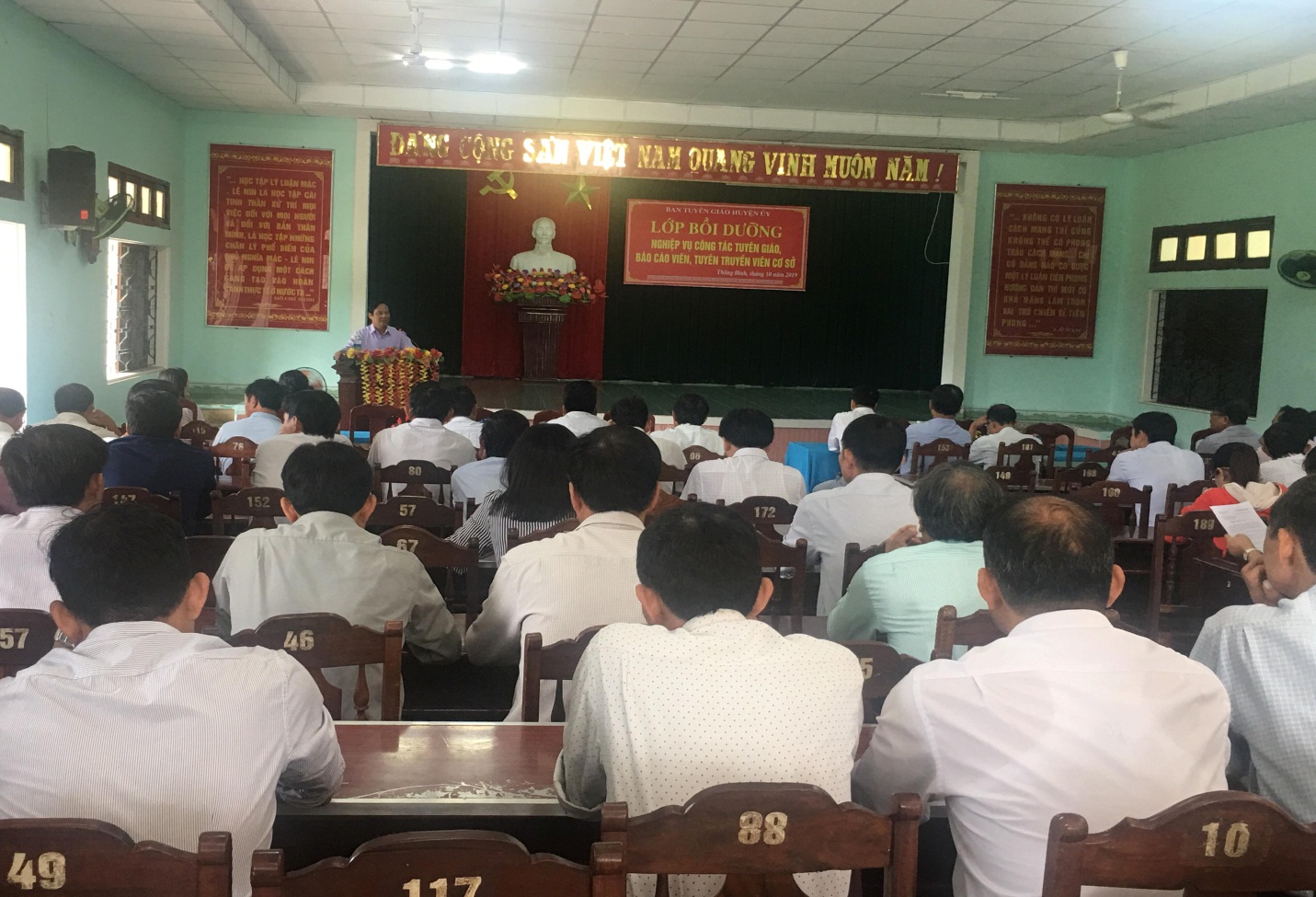 Theo kế hoạch, lớp được tổ chức trong 02 ngày từ ngày 17 đến 18/10/2019, các học viên được nghe các đồng chí lãnh đạo Ban Tuyên giáo Huyện ủy, Báo cáo viên Huyện ủy truyền đạt các chuyên đề gồm: công tác giáo dục lý luận chính trị và giáo dục truyền thống cách mạng ở cơ sở; công tác tuyên truyền, cổ động ở cơ sở; công tác văn hóa, văn nghệ ở cơ sở; công tác khoa giáo ở cơ sở; kỹ năng chuẩn bị và kỹ năng tổ chức một buổi tuyên truyền miệng. Đây là những kiến thức, kỹ năng, nghiệp vụ được cập nhật mới nhất và rất cần thiết cho đội ngũ cán bộ làm công tác tuyên giáo, báo cáo viên, tuyên truyền ở cơ sở.